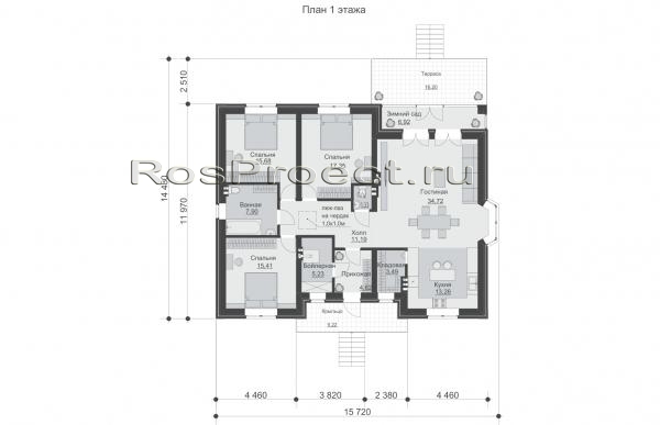 Одноэтажный дом с зимнем садом, 3 спальнями и кладовой RPg3546