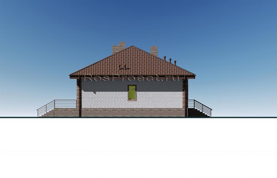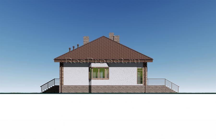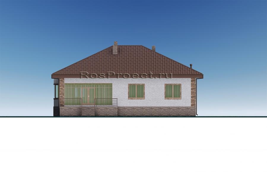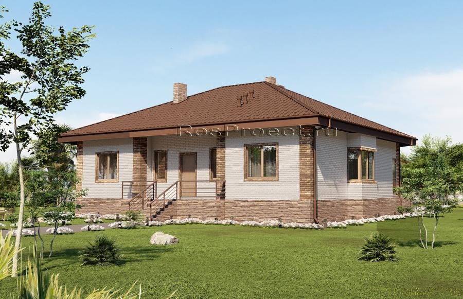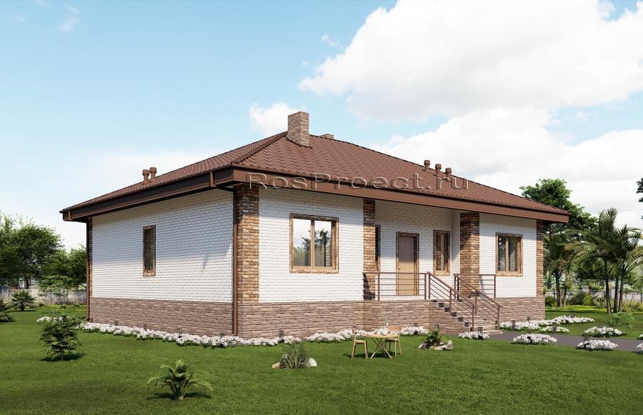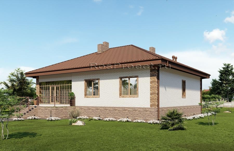 Проект одноэтажного дома с террасой, 3 спальнями и отделкой облицовочным кирпичом с размерами здания 12,37х13,17 м. Фундамент — ленточный монолитный с подошвой. Наружные стены здания - пеноблок с вентилируемым зазором и отделкой облицовочным кирпичом. Внутренние стены здания - пеноблок. Перегородки здания - пеноблок. Пол этажа - пол по грунту. Чердачное перекрытие - монолитное железобетонное. Крыша - четырехскатная. Кровля - металлочерепица. Окна — металлопластиковые.